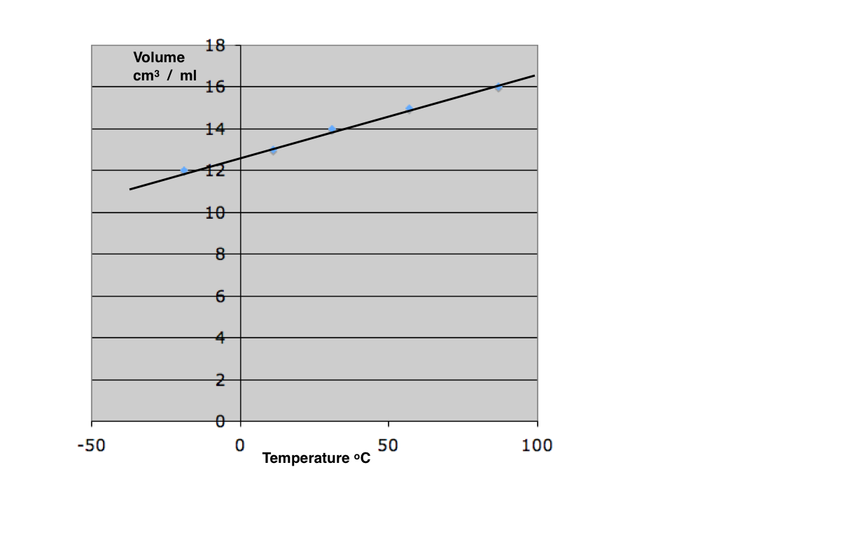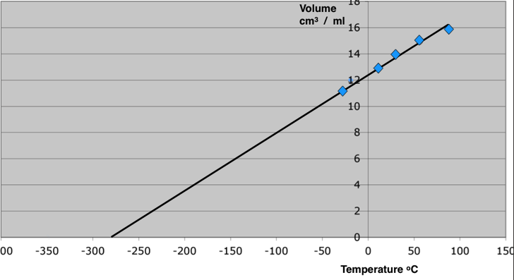 If in and experiment, we trap gas in a syringe and then cool that gas down, because the molecules move slower and slower as the gas cools the volume decreases. A plot of the temperature against volume of the air trapped in the syringe is (close to) a straight line. If we assume that the volume of the molecules of a gas is insignificant, compared to the volume they occupy due to their motion (something that is quite close to being true for light gases). If we then extend the scale of the graph and “extrapolate” the graph line until it cuts the temperature axis then that is the theoretical temperature at which there is zero volume. At this point the molecules must have stopped. This is our estimate of absolute zero temperature.
