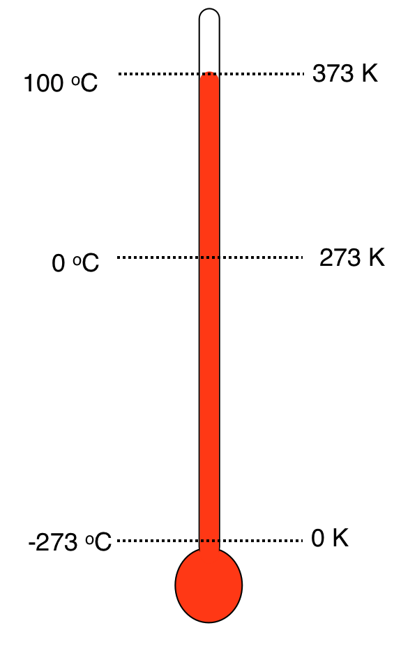 The Kelvin scale uses the same sized divisions of temperature but zero is at “absolute zero” and so the melting point of ice is 273 K and the boiling point of water is 373 K.