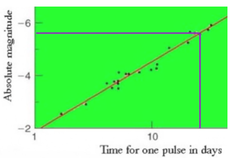 From the pulse rate we use the graph to estimate the absolute magnitude of the star. We then calculate the distance comparing the apparent magnitude with the absolute magnitude.
