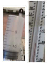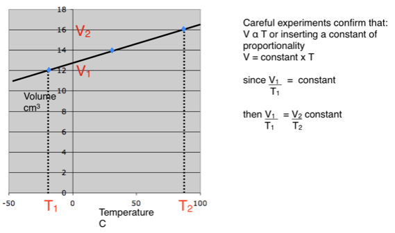 A fixed mass of gas is trapped in a plastic syringe. The syringe is then placed in a bath of water which is heated. The volume is then measured and plotted against temperature, producing the straight line graph.