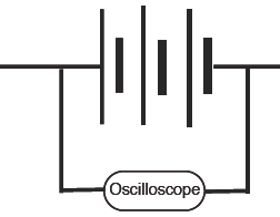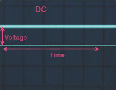 A cell or a battery (a group of cells) supply direct current. If we connect a battery to an oscilloscope we can see a graph of the change in potential difference (voltage) with time. The graph we see is a horizontal line. The potential difference is steady and in one direction. If the battery is connected to a circuit a steady current will flow in one direction.