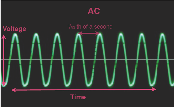 If we connect it to an oscilloscope to the live and neutral of a mains supply to see a graph of potential difference (voltage) plotted against time then the graph rapidly moves up and down. The potential difference changes from one direction to the other many times per second in a sinusoidal pattern. In the UK there are 50 complete changes every second (50Hz).
