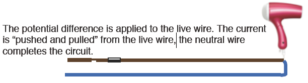 The potential difference is applied to the live wire. The current is “pushed and pulled” from the live wire, the neutral wire completes the circuit.