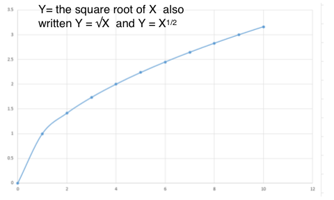 Y proportional or equal to the square root of X also written Y = √X and Y = X1/2