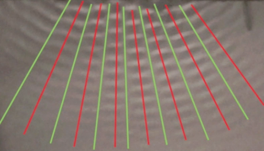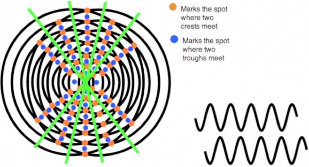Drawn on top of the wave photo are lines of constructive interference in red (where there are waves) and lines of destructive interference in green (where there are no waves)