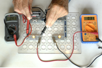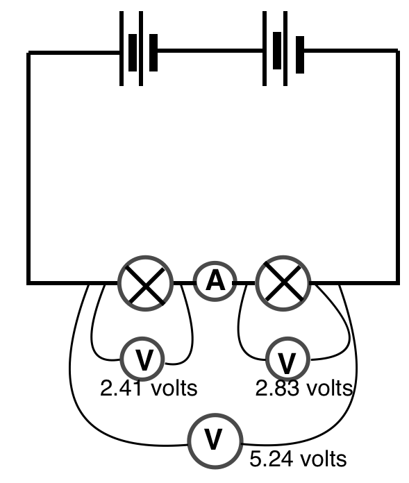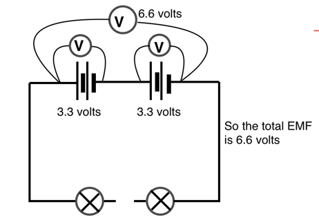 Here we are measuring the voltage across the cell when it is doing almost no work. Only a tiny current is flowing to operate the voltmeter but none is flowing around the bulbs because the circuit is incomplete. We are measuring the EMF which is a total of 6.6 volts for the four cells.