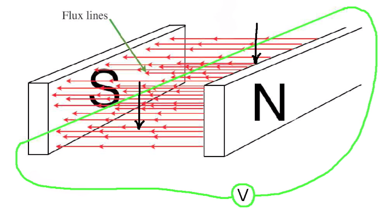 We indirectly use Faraday's Law to define magnetic flux. Imagine a wire cutting down through this magnetic field. The EMF produced depends upon how fast we cut through the field. If we move the wire faster, if the magnetic field is stronger or if there are more coils of wire then the EMF will be larger.