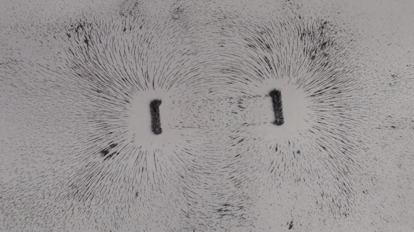 The classic method of revealing the shape of a magnetic field is to use iron filing on a sheet of paper near the magnet. On a simple bar magnet the shape is like this: