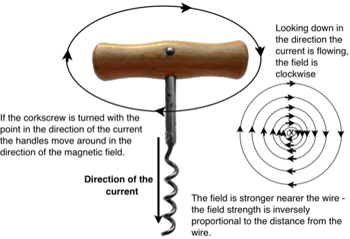 An electric current flowing through a wire produces a magnetic field around it. The field around a single wire is generally very small. The strength depends on the size of the current and the distance from the wire. In reality, unless the current is very large it is hard to see the field using iron filings, but can easily be detected with a magnetic compass. The field is circular and clockwise, looking in the direction of conventional current flow.