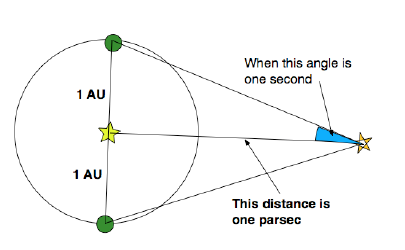 The Parsec is a unit very commonly used by astronomers and derived from the AU. It is based upon the parallax method of measuring distances. The change of the angle of observation of a star is measured against a background of other stars at some time in the year and then again six months later. In that time the Earth will be 2AU from itsʼ starting point. If, from the geometry, the angle marked in blue is 1 second (that is 1/3600 of a degree) then the distance to the star is one parsec.