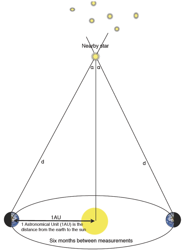 If we tried to use a baseline on earth then the angle to a very distant star would be very hard to measure accurately. To get a large baseline we take a measurement and then wait six months to take a second measurement. During that time the Earth completes half of its orbit around the Sun and we use that as the baseline.The change of angle is measured against the background shift of very distant stars behind the one which we are measuring.