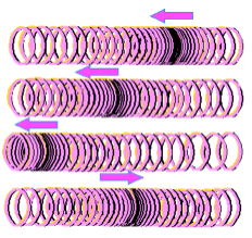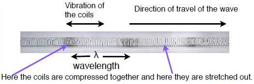 is a “pushing” wave. A line of dominos falling is an example although not a real practical example. Another way to illustrate a longitudinal wave is with a slinky spring. If one end of a slinky is pushed and pulled then each coil pushes and pulls the next. The coils oscillate along in the same direction that the wave is traveling. Proper practical examples of longitudinal waves are sound and the electrons in a wire transmitting an alternating current.