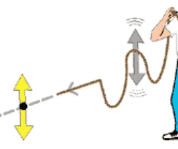 A shaking rope is a good example of a transverse wave. The wave moves along the rope but the bits of rope go up and down - across the direction of the wave. “Trans” means across, think of “transatlantic” or “transfer”. Most of the examples of waves we have to deal with are transverse waves. All the waves in the electromagnet spectrum are transverse waves.