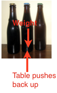 For example these beer bottles have the force of gravity pulling them down but they don’t move because the table top is pushing up at the same time, with an exactly equal and opposite force. The overall force is zero.