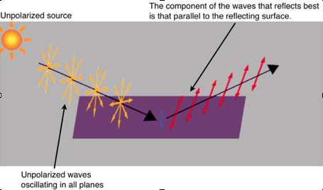 Sunlight reflecting from sea, sand or snow is partly polarised. The waves oscillating in a vertical plane are absorbed much more than those oscillating horizontally.