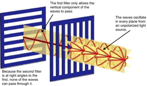 The diagram below is to explain the general idea of a polaroid filter, not the precise way in which it works! Light entering the first filter is not polarised, the waves oscillate in every plane. The first filter will only allow waves oscillating in a vertical plane to pass through. If a second filter is then placed at right angles to the first then it will allow no light to pass.