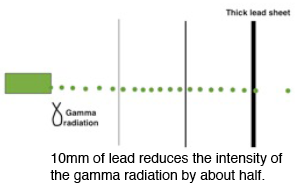 The intensity of gamma is reduced after passing through one sheet of lead. If the lead is 10mm thick the intensity will be reduced to about half. Passing through similar sheets it may halve it again and again and again - but does not completely disappear. Gamma radiation has effectively an infinite range in air.
