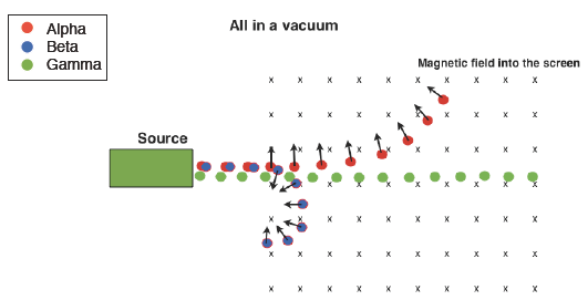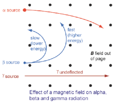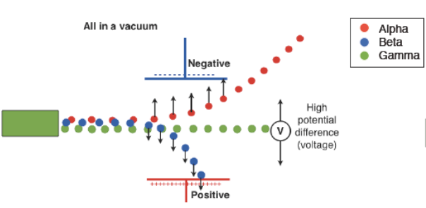The path they take in the electric field is parabolic because the force is constant and in one direction. The deflection of alpha in the diagram is exaggerated. Beta has only half the charge of alpha but it is deflected far more because beta has a much smaller mass (about 1/8000). Gamma radiation is unaffected by an electric field because it is not charged.