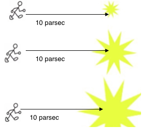 To properly compare the brightness or magnitude of different stars we assess how bright they would seem to be if we were 10 parsecs away.