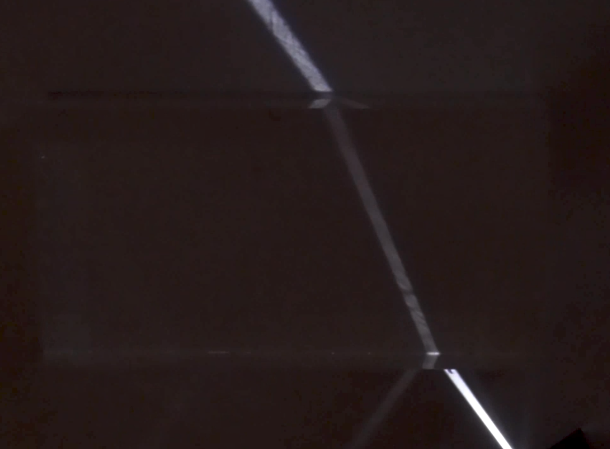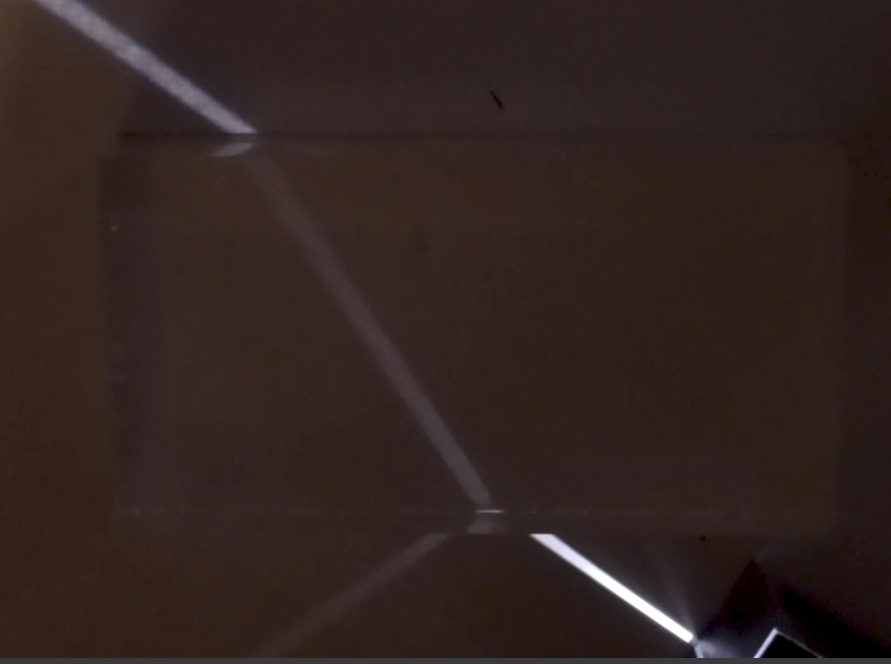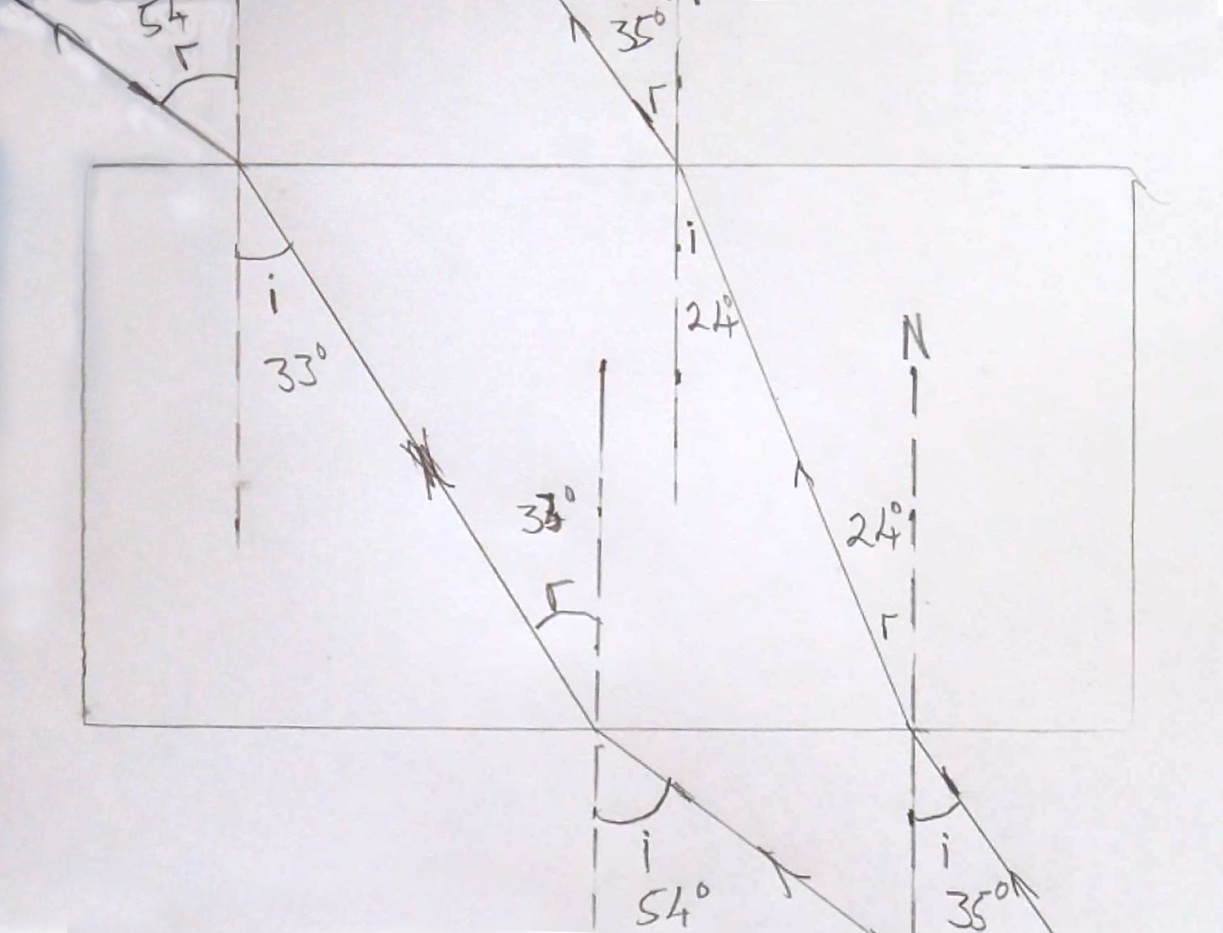We can make a measurement of the refractive index by measuring the angle of incidence and refraction as light passes from one medium to another. The images below show two rays entering the same block and then a drawing which was made by marking the paths of the rays and measuring the angles.