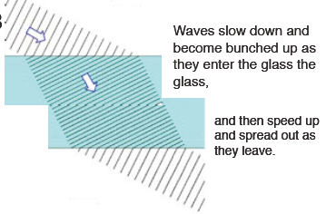 Waves slow down and become bunched up as they enter the glass the glass and then speed up and spread out as they leave (note that the speed and the wavelength change but the frequency remains the same).