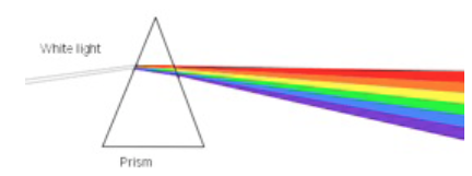 When we pass light through a shape where the sides are not parallel, as in this prism, we get a spectrum. Because the speed of the different waves, which we see as colour, travel at different speeds in dense material. (They all travel at the same speed in a vacuum and almost the same in air). As a consequence the different waves/ colours in white light refract differently. Blue slows the most and is refracted the most, red refracts the least and so the white light is split up.