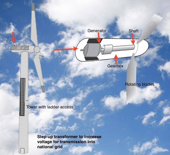 An anemometer measures the speed and direction of the wind to turn the tower and adjust the pitch of the blades. The rotating blades drive the shaft. The speed in increased by the gearbox to turn the generator at an appropriate speed. The voltage of the electricity generated is increased for transmission into the national grid by a step-up transformer at the base of the tower.