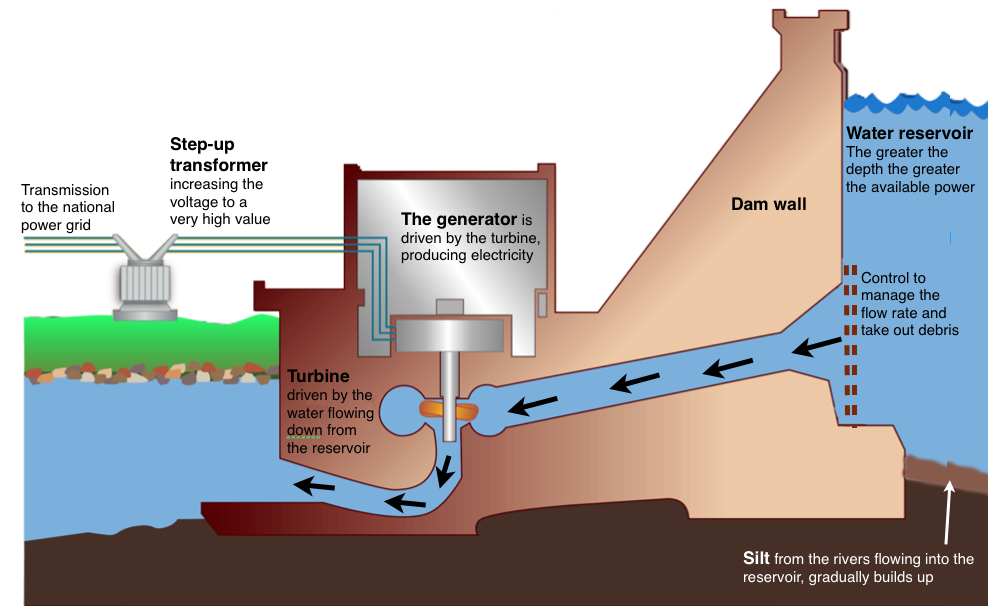 Works by capturing water behind a dam wall fairly high in the hills and then allowing it to run out of a channel through a water turbine driving a generator.