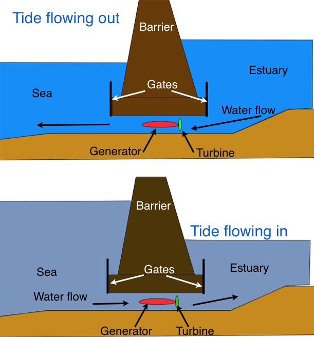 Tidal barriers harness the energy of the sea as the tide flows in and then out twice each day
