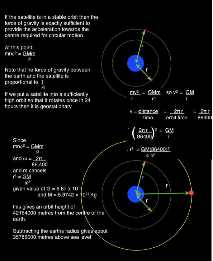 Where M is the mass of the Earth, m the mass of the satellite, r is the height of the satellite from the centre of the Earth and G is the universal gravitational constant.