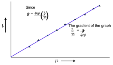 To finally determine the acceleration due to gravity g we aim to reduce systematic errors in the calculation. First we make measurements of the time period of a number of lengths of the pendulum. Then we plot a graph l against T2 . This is a way of checking because all the points should be on or close to a straight line.
