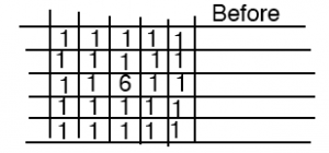 The software examines the code of each pixel and makes each an average of those immediately around, like this (the numbers are kept small here to make the example easier to follow):