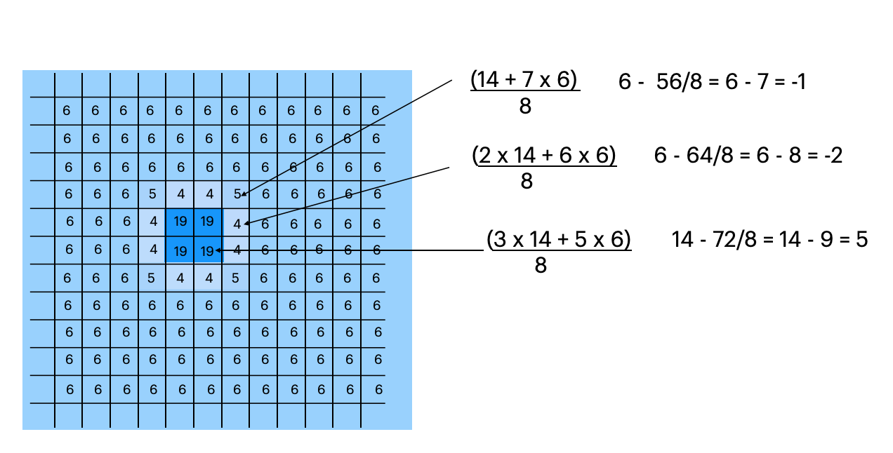 The software examines the code of each pixel and makes each an average of those immediately around, like this (the numbers are kept small here to make the example easier to follow):