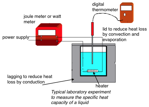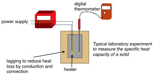 The two diagrams below show the standard experimental equipment used to measure SHC in the laboratory. In the video lesson below the diagrams I use more everyday equipment to perform a similar experiment.