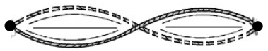 By doubling the frequency of vibration we can produce a constant pattern of two loops. A standing wave with half the wavelength and double the frequency of the fundamental wave.