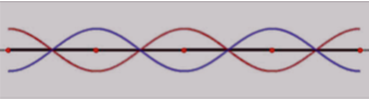 The parts of the string/wire/spring that oscillates most is called the “antinode”, the parts that are still are called the “nodes”. One wavelength is the total distance between 3 nodes, that is across two loops, as shown below. The most simple vibration, a single loop is called the fundamental note. The wavelength of this note is twice the length of the string.