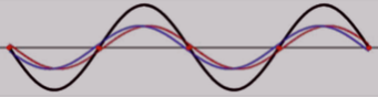 The red wave moving to the right and the purple wave moving to the left are meeting crest to crest and trough to trough. The resulting constructive interference produces a large wave. (In black)