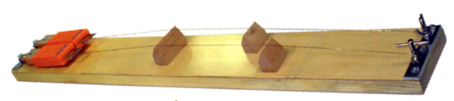School experiments with standing waves are commonly performed using a sonometer on which you can change the tension and length of the vibrating wire. This is pictured below. It consists of a moveable “bridge to vary the length of the wire and a weight or twisting post to apply (and change) the tension in the wire. Part of the wire, between the triangular bridges can be plucked to sound the note.