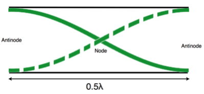 A standing wave in a tube is produced by interference with the wave traveling down the tube and its reflection from the end. The standing waves in a tube are represented by a graph line shown in green. This indicated the amount of vibration, but it can be misleading. It seems to show the molecules vibrating across the tube, but the do not. Sound is a longitudinal wave, the molecules vibrate back and forth along the tube.