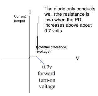 A diode will only conduct electricity in one direction (see diagram). And it will only conduct easily when the potential difference reaches a “threshold voltage” of about 0.7 volts.