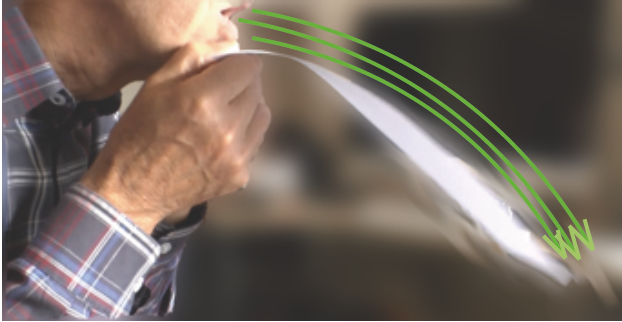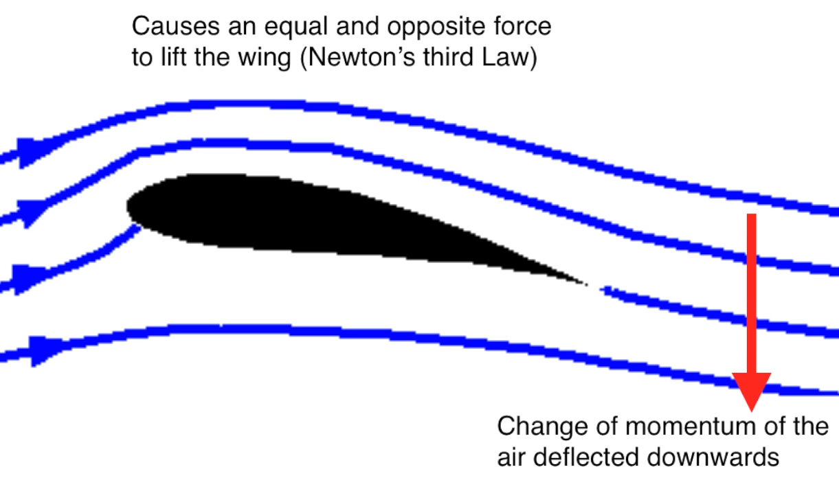 The Coanda Effect is the tendency of a stream of fluid (liquid or gas) to cling to a surface. The upper surface of a wing is curved with the trailing edge inclined down. The air flowing over the wing is therefore deflected downwards and a equal and opposite thrust pushes the wing upwards.