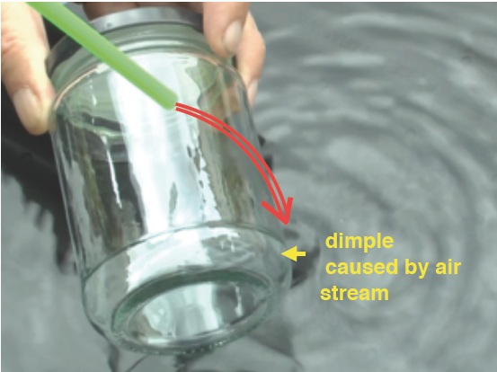 If you use a straw to blow across the side of a jar the jet clings to the side and curls around it. You can see that the dimple on the water, in picture 1, is below the jar.