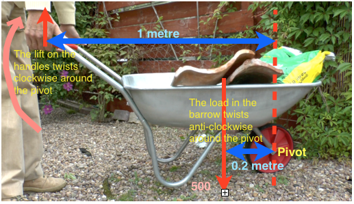 The load in the barrow is 500N and we can calculate the force (F) to just lift (balance) it.