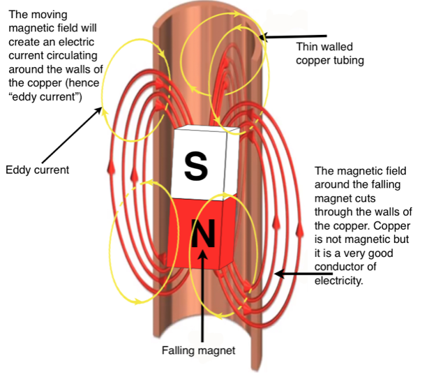 A magnet falling in a copper tube is a good example of the creation of eddy currents and the effect they have. These currents form in the copper tube. They form because the magnetic field around the falling magnet is cutting through the tube. These eddy currents create a magnetic field of their own which opposes the movement of the magnet (Lenzʼs Law), noticeably slowing its fall (see video below)