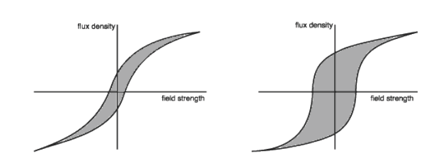 Hysteresis -The changing flux in the core, created by the coil, is essential in the transfer of energy from the primary to the secondary coil. If the core is hard to magnetise and demagnetise then extra energy is needed and the transformer is less efficient. The curves show the relation between the two in different materials. The shaded area is a measure of the energy absorbed in a complete AC cycle.