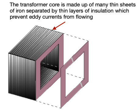 Similar eddy currents can form in the core of a transformer particularly if it is a solid lump of iron. That is because of the rapidly changing current in the coils. To reduce the amount of current that can flow the iron core is made from thin sheets of iron. These thin sheets are separated by thin layers of insulation to prevent current flow.