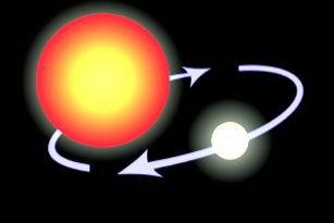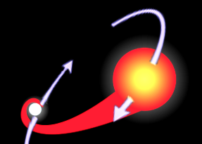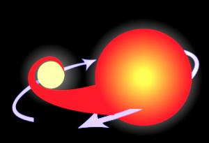 6 The smaller of the two stars eventually reaches the red giant stage. Gas from the red giant spills onto the white dwarf attracted by the strong gravitational field of the small dense body.