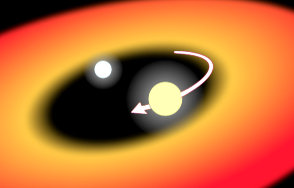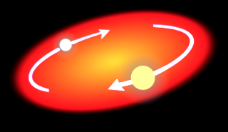 5 The two stars spiral towards each other and so orbit at a much smaller distance. The larger star completes the red giant stage and becomes a white dwarf and the remaining gas cloud is blown away.